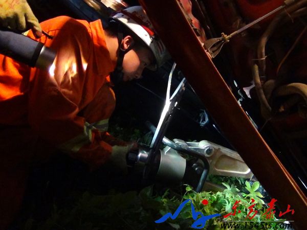 消防官兵到達(dá)現(xiàn)場(chǎng)后,根據(jù)現(xiàn)場(chǎng)偵察情況,中隊(duì)指揮員立即下達(dá)命令展開(kāi)救援,劃分兩個(gè)戰(zhàn)斗小組:第一戰(zhàn)斗小組出泡沫槍一支,對(duì)其車(chē)體漏油處及四周進(jìn)行泡沫覆蓋,防止因漏油引起爆炸。第二戰(zhàn)斗小組架設(shè)移動(dòng)照明設(shè)備并展開(kāi)救援。由于貨車(chē)頭部重量過(guò)大且變形嚴(yán)重,被困者腰部以下被死死卡住,危在旦夕,為了更好的進(jìn)行營(yíng)救,中隊(duì)聯(lián)系了交警部門(mén)請(qǐng)求調(diào)集吊車(chē)進(jìn)行協(xié)助救援。